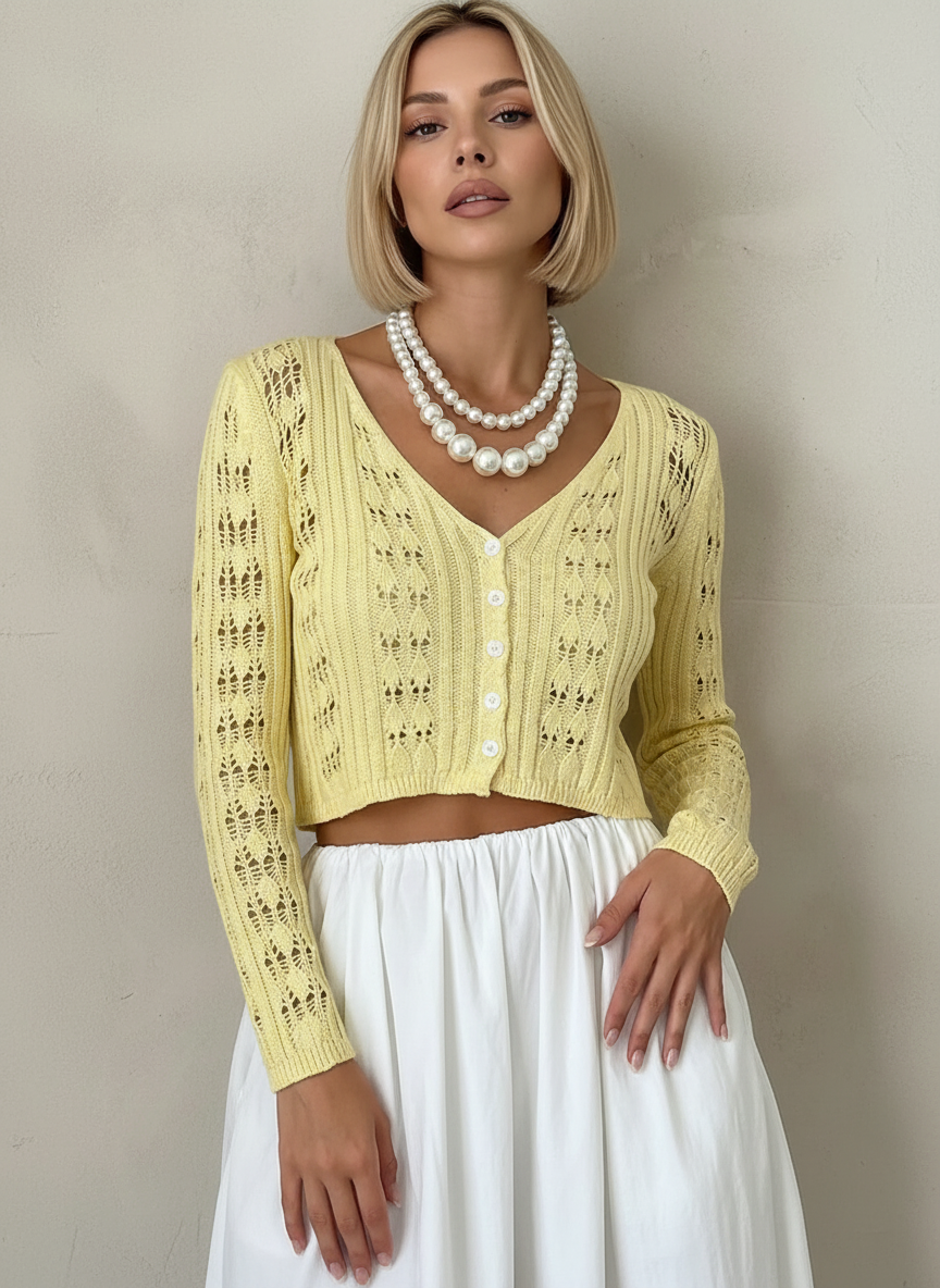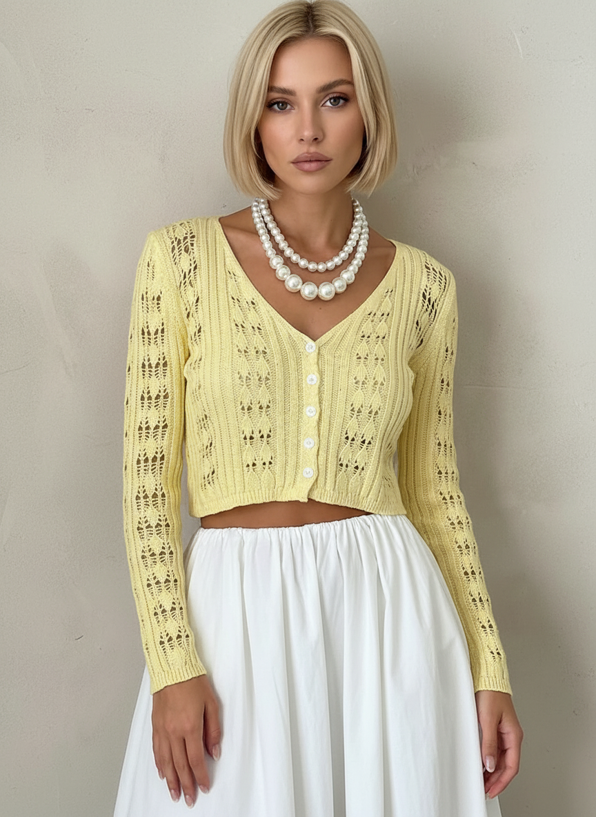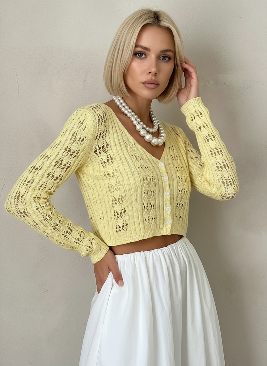 V-Neck Lon Sleeve Cutout Retro Cropped Cardian-Yellow
